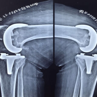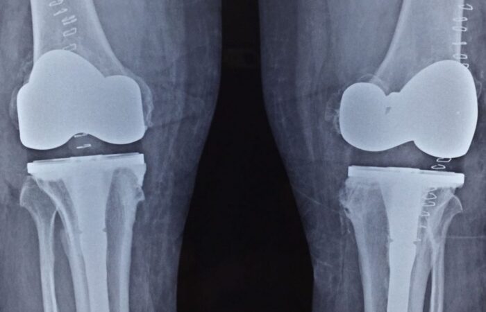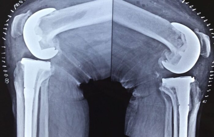 X-rays of patient of bilateral knee replacement in one sitting before and after surgery